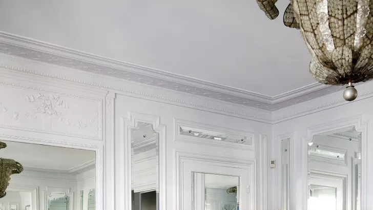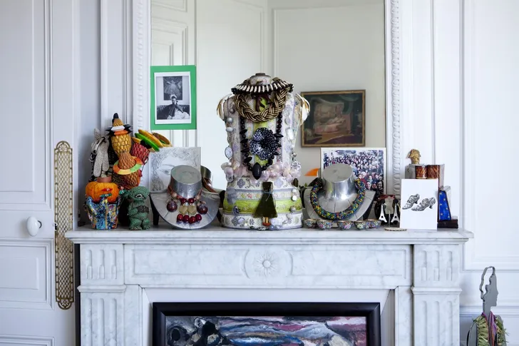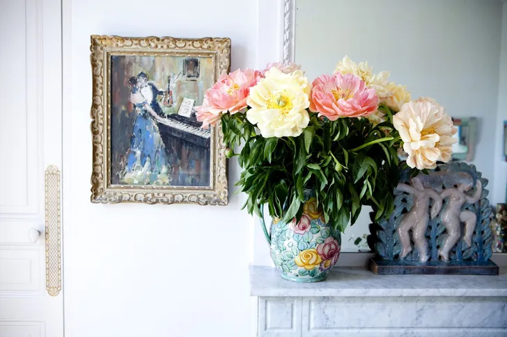 Het hoekappartement van rond 1900 heeft nog steeds de originele, nu tot in detail gerestaureerde, ornamenten, stucwerk, houten panelen en lambriseringen. Rosita koos voor dit appartement een lichte basis door alle wanden en het plafond wit te maken. Heel anders dan in haar Italiaanse huizen. ‘Hier kies ik voor een contrast tus- sen het frisse wit met de kleuren in mijn sto en, meubels en kunst. Het geeft dat gevoel van Parijse chic, dat hier zo past.’ Ze ging op zoek naar meubels en kunst uit de jaren 20 en 30 van de vorige eeuw, een stijl- periode waarop ze dol is. Antieke stoelen met ronde houten leuningen bekleedde ze opnieuw met kleurrijke sto en uit eigen col- lectie. En verspreid liggen op de houten vloer in visgraatpatroon, kleurige kleden. Aan de wand hangt kunst, er staat een beschilderd antiek kamerscherm en overal zijn combinaties te vinden van souvenirs, vazen en dierbare objecten. ‘Ik ben gek op vlooi- enmarkten, ook hier in Parijs vind ik er altijd iets moois. Ik ben een verzamelaar en kom vaak met iets bijzonders thuis.’