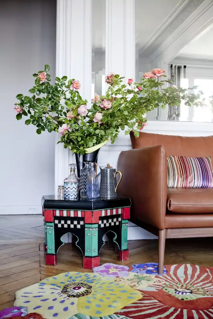 Op een leeftijd waarop anderen van hun pensioen gaan genieten, droeg ook Rosita het stokje over aan de volgende generatie. Maar stilzitten bleek geen optie. In haar eigen tempo en in haar eigen stijl ontwikkelde ze de Missoni Home-collectie. ‘Niet meer dat jachtige en snelle; de tijd van nachtclubs en feestjes ligt lang achter me. Maar ik merkte dat mode ook zijn intrede in huis deed en daar vond ik een echte passie: huizen nog jner en mooier maken.’ Dit Parijse appartement lijkt in veel opzichten op Rosita zelf. De basis is rustig, maar er is altijd een kwinkslag, een onverwachte combinatie van kleuren en patronen. Vrolijkmakend – net als de pretogen van Rosita.