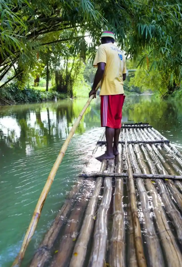 Terwijl onze raftkapitein met een bamboestok het vlot bestuurt, zitten wij hoog en droog en trekken mangrovewoud en bananenpalmen voorbij.