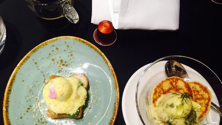 Voor het ontbijtgerecht 1. Toast het boekweitbrood. 2. Pocheer de eitjes gedurende 3,5 minuten door water met een eetlepel azijn aan de kook te brengen in een diepe pan en vervolgens een draaikolk te maken met de achterkant van een pollepel, waarna je het eitje uit de schil meteen in de draaikolk gooit. Laat het zachtjes 3,5 minuut sudderen waarna je het eitje afkoelt en schoonspoelt in een bakje koud water. Laat het gepocheerde ei voor serveren nog even uitlekken. 3. Rol de eitjes in de zalm en leg in het midden van het broodje. 4. Bedek met een mooie eetlepel bearnaisesaus en garneer met wilde kruiden en bloemen.
