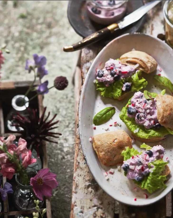 Doe alle ingrediënten voor de spread, met uitzondering van de slagroom en het zout, in een keukenmachine en laat een paar minuten draaien. Voeg al draaiend langzaam de slagroom toe. Proef of er nog wat zout bij moet. Verhit de olie in een ruime pan met dikke bodem en voeg de uien en sinaasappelschil toe. Laat dit op niet al te hoog vuur ongeveer dertig minuten zachtjes garen, roer regelmatig en laat niet bruin worden. Voeg hierna zout, suiker, dragonazijn en marjolein toe en laat nog tien minuten inkoken, of tot de suiker helemaal is opgelost en het vocht bijna is verdwenen. Snijd de broodjes open en leg er wat slablaadjes op. Besprenkel met wat olijfolie. Leg op de sla wat spread en Parmezaanse kaas, radijsjes en blauwe bessen. Serveer met de zoetzure uien.