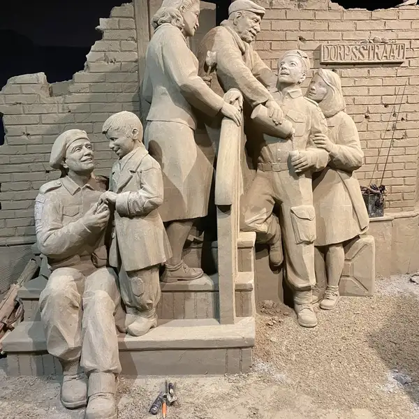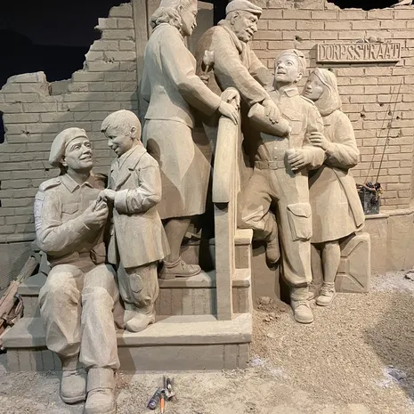 Vanwege het thema nemen de creaties je mee terug in te tijd. Zo laten de sculpturen belangrijke veldslagen als ‘Slag om Arnhem’ en D-Day zien, maar ook de bevrijding, het leven van Anne Frank, spotprenten, Radio Oranje en het Koningshuis zijn terug te zien in zand.