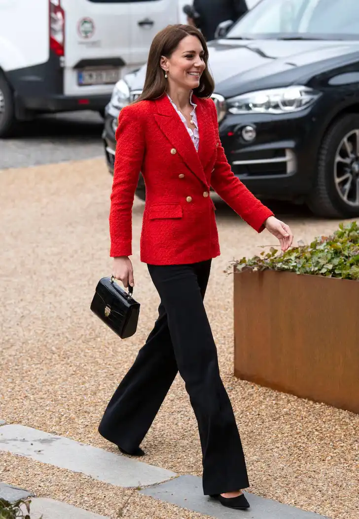 De rode getailleerde blazer die Kate voor de gelegenheid droeg, was deze keer niet van een luxe designer, maar van 'gewoon' van Zara. Daarbij droeg ze een zwarte broek, witte blouse van ME + EM en zwarte hakken van Gianvito Rossi. Ze maakte de look af met een van haar favoriete tassen van Aspinal London en een parelketting en -oorbellen van Maria Black.