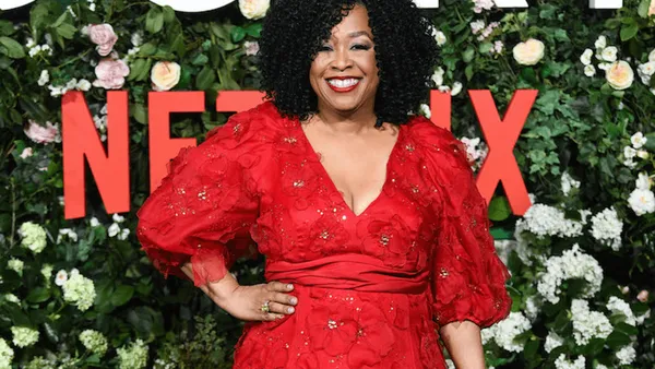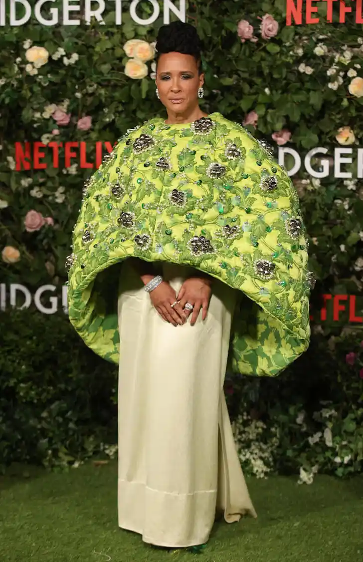 Actrice Golda Rosheuvel, die Queen Charlotte speelt in de serie, heeft haar outfit perfect afgestemd op het bloemrijke Bridgerton-decor. Net als Shonda geeft ze haar outfit nog meer regency glam door het prachtige borduurwerk.