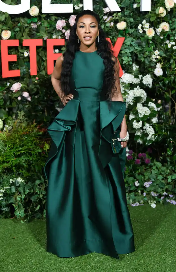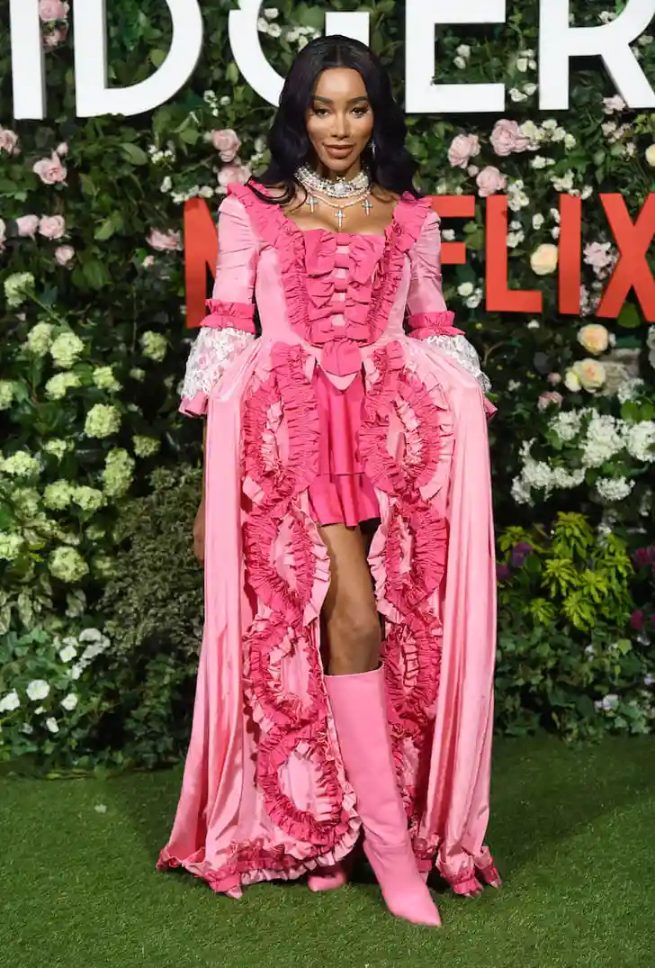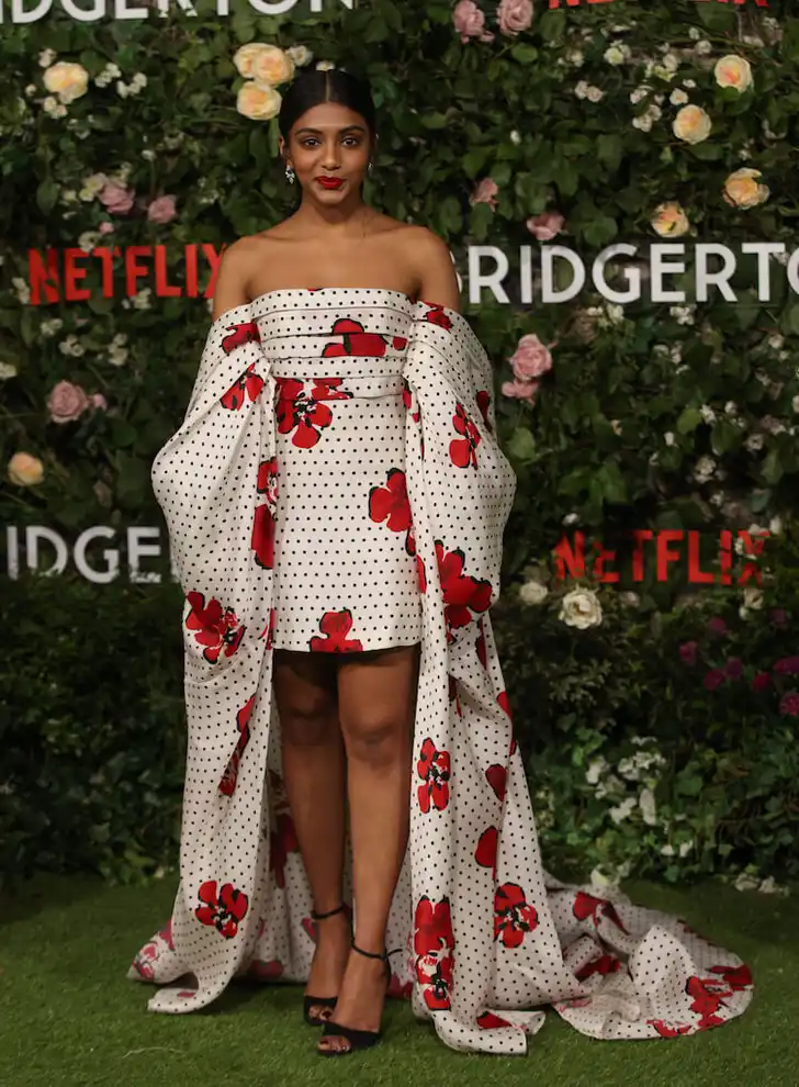 Een nieuw gezicht in seizoen twee is Simone Ashley, die de rol van Kate Sharma op zich neemt. Tijdens de Bridgerton-première ging ze voor Gucci en kant van top tot teen.