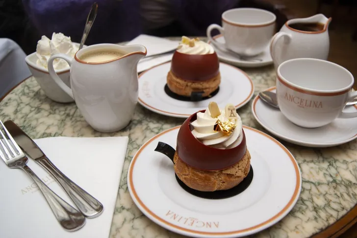 Dit theehuis tegenover de Tuilerieën bestaat al sinds 1903 en dankt haar naam aan de Oostenrijkse banketbakker Antoine Rumpelmayer Angelina. Al vanaf dag één is de theesalon een geliefde hotspot waar niet alleen Parijzenaren graag hun theetjes en pâtisseries nuttigen, maar waar ook regelmatig beroemdheden worden (en werden) gespot – Coco Chanel en Marcel Proust waren bijvoorbeeld Graag Geziene Gasten. En dat wil natuurlijk wel wat zeggen over de kwaliteit van de kaart. Hoewel Angelina als salon de thé bekendstaat, wordt de zaak vooral geroemd om zijn africain (warme chocolademelk, net vloeibaar genoeg om te drinken) en de chou caramel-cacahuète (een karamelgebakje). Geloof ons, dit is het lekkerste wat je ooit hebt geproefd en mag je jezelf écht niet onthouden. Beloofd?!