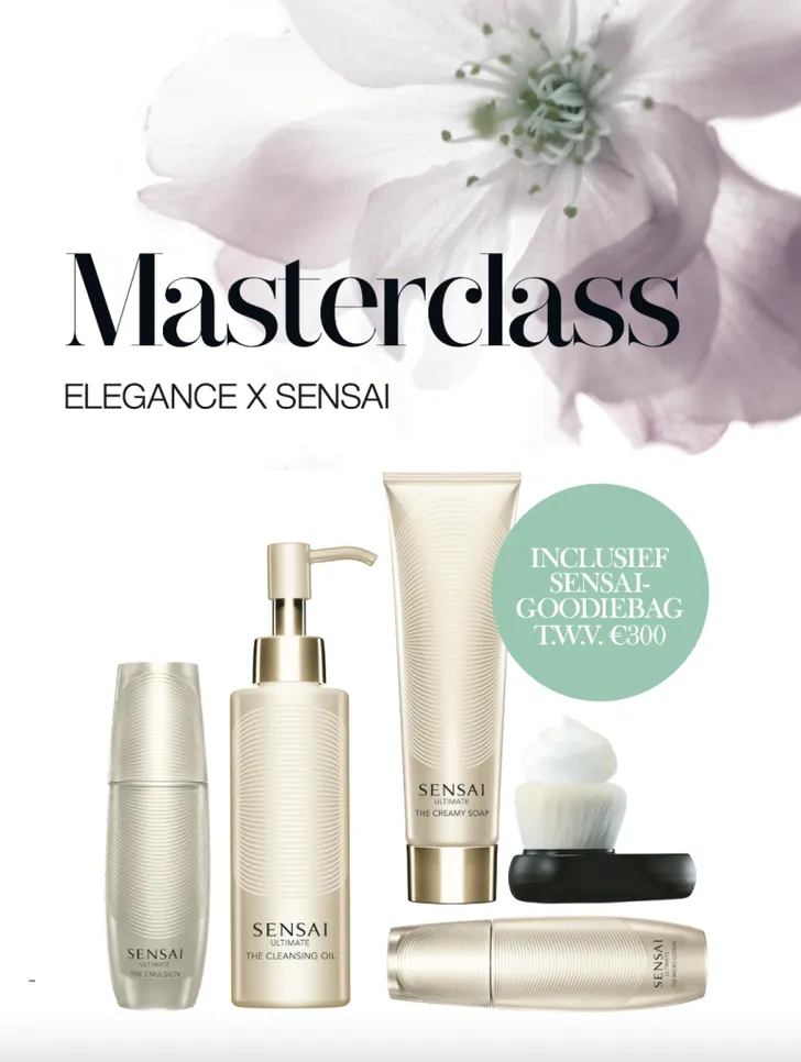 Zelf de bijzondere producten van Sensai en het unieke effect van Koishimaru Zijde ervaren? Dat kan tijdens de Elegance x Sensai masterclass. Experts van Sensai laten je de complete Ultimate-lijn proberen, waarbij niet alleen op de waarden van het merk wordt ingegaan, maar ook de volledige gebruiksfilosofie wordt doorgenomen.