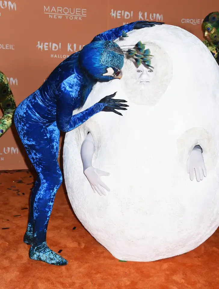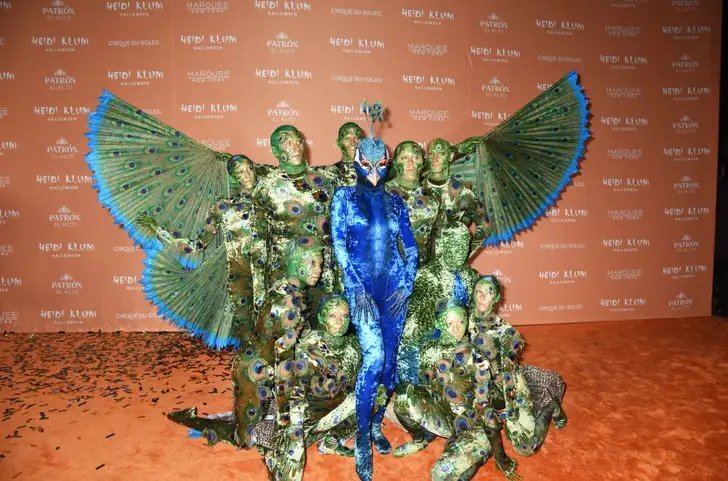 Nadat de geruchtenmolens inmiddels overuren draaiden, was het moment eindelijk daar. Na tientallen A-listers was het tijd voor het supermodel om te paraderen over de oranje loper tijdens haar Halloween-feest in New York. En wat bleek? Ze kwam niet alleen opdagen! Samen met tien acrobaten van Cirque du Soleil vormde ze een immens grote pauw. Heidi vormde natuurlijk the center in haar blauwe pak – inclusief bek en masker. De acrobaten vormden met z'n allen de vleugels, veren en poten van de pauw.