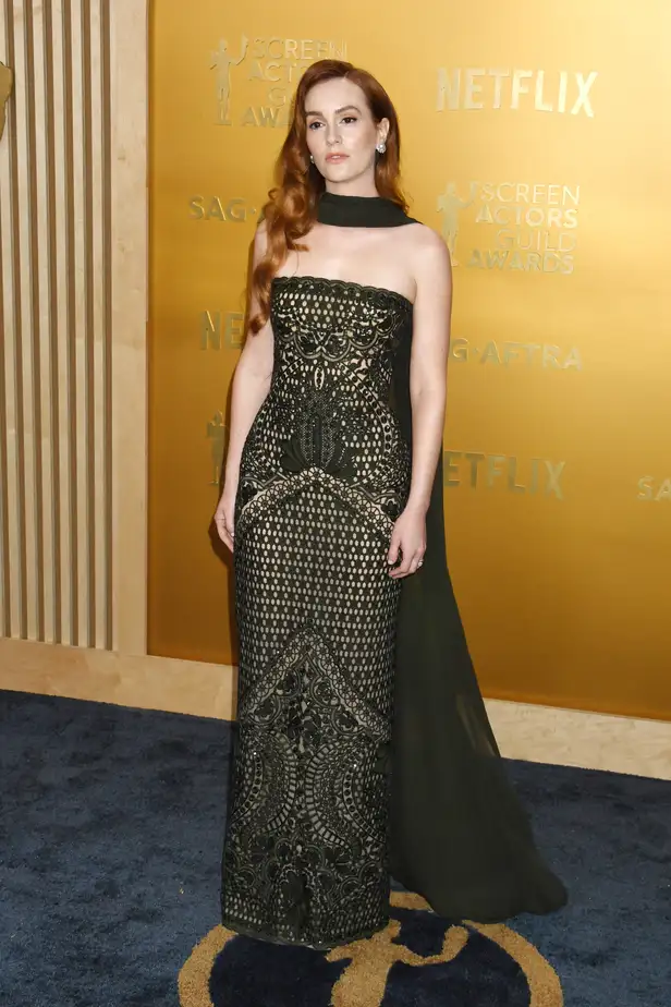 Leighton Meester straalde in een olijfgroene, strapless jurk van Ellie Saab, versierd met bloemmotieven en bijen-inspiraties. Ze voegde een lange groene sjerp toe en droeg pareloorbellen van Mikimoto. Haar roodachtige haar was in zachte golven gestyled, met koraalkleurige oogschaduw en lippen die haar look compleet maakten.