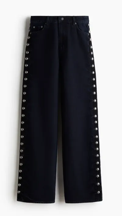 H&M heeft weer iets slims gedaan. Waar jeans vaak op veilig spelen, kiest deze versie voor lef: een donkere denim met zilverkleurige knopen langs de hele zijkant. Het resultaat is een broek die iets wegheeft van couture, maar gewoon uit het rek komt — en voor €79,99 is dat bijna onvoorstelbaar.