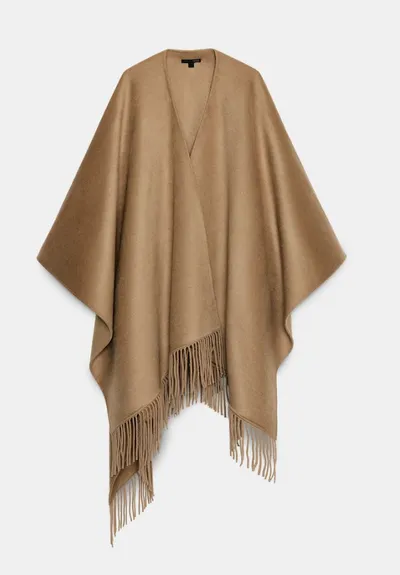 De kleur is warm en tijdloos, het model ruim en soepel. De franjes aan de onderkant geven net genoeg beweging, waardoor de cape nooit stijf oogt. Drapeer hem nonchalant over een trui en jeans of combineer met een zwarte col en hoge laarzen voor een luxueus silhouet.