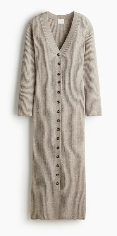 De jurk is lang, heeft een diepe V-hals met knoopsluiting en is gemaakt van een zachte, geribde stof die zich aanpast aan je lichaam. De tint – een warme zandkleur – straalt luxe uit zonder dat je er moeite voor hoeft te doen. Het is de ultieme mix van huiselijke warmte en minimalistische elegantie.