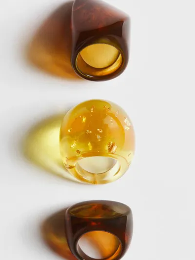 Deze set van H&M is daarbij ideaal omdat de kleuren perfect bij elkaar passen. De twee donkere ringen hebben die diepe, amberachtige gloed die doet denken aan vintage sieraden van vroeger. De transparante ring met goudkleurige stukjes zorgt voor een lichtaccent dat prachtig vangt in het zonlicht. Samen vormen ze een mini-sieradencollectie waar je alle kanten mee op kunt.