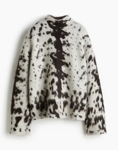 Het eerste dat opvalt, is het bijzondere patroon. Alsof iemand een kunstige penseelstreek heeft laten dwarrelen over een zachte, wollige basis. De offwhite achtergrond vormt een rustige basis, terwijl de diepe donkerbruine vlekken zich verspreiden als een abstract kunstwerk. Niets regelmatigs, niets symmetrieus, maar juist die willekeur maakt het geheel spannend. Deze trui is niet bedacht om op te gaan in de massa, maar om precies genoeg op te vallen zonder overheersend te worden.
