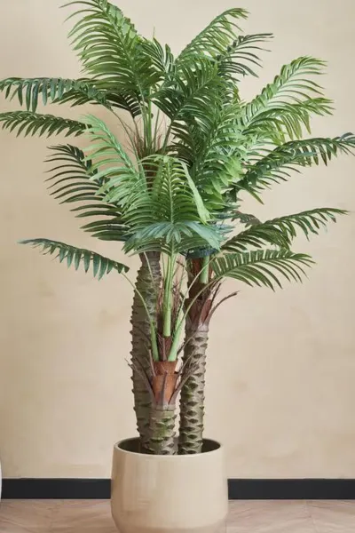 Wat deze palm onderscheidt, is de vorm. De bladeren zijn vol, de stam oogt stevig en de plant heeft precies die nonchalante vibe waar je interieur blij van wordt. Je hoeft niets water te geven, niets te snoeien en toch oogt hij alsof hij net bij een plantenwinkel vandaan komt. Bovendien past hij in bijna elke woonstijl: modern, landelijk, minimalistisch of lekker kleurrijk.