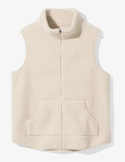 De bodywarmer is gemaakt van een zachte, wollige stof die je al warm maakt door er alleen maar naar te kijken. De kleur is neutraal en past daardoor bij werkelijk alles wat al in je kast hangt. De hoge kraag geeft het geheel een knusse uitstraling en zorgt ervoor dat gure dagen ineens veel beter te verdragen zijn. Het ontwerp is simpel, maar heel doordacht. Precies genoeg details om mooi te vallen, zonder te overheersen.