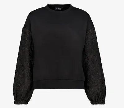 Op het eerste gezicht lijkt het een klassieke zwarte sweater. Tot je naar de mouwen kijkt. Het bloempatroon geeft een subtiel, bijna speels reliëf dat de trui meteen luxer laat lijken. Het maakt hem bijzonder zonder te overdrijven. Dit is precies het soort kledingstuk dat je aantrekt wanneer je comfortabel wilt zitten, maar niet per ongeluk onder de radar wilt verdwijnen. De vorm is losjes, de stof oogt zacht, en de afwerking bij de boorden houdt het geheel netjes.