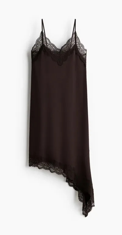De jurk in kwestie is een bruine satijnlook slipdress met kanten details langs de halslijn en aan de asymmetrische onderrand. Het soort jurk dat je ogen meteen vangt, omdat hij iets geheimzinnigs heeft. Alsof hij meer belooft dan hij laat zien. De prijs? €24,99. Dat is precies waarom dit item nu zoveel aandacht krijgt: het ziet eruit als een ontwerp dat duurder oogt dan het is, en dat maakt hem onweerstaanbaar voor modeliefhebbers die alweer op zoek zijn naar iets verfijnd én betaalbaar.