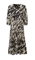 Wat deze jurk zo aantrekkelijk maakt, is de print. Dierenprints en abstracte pasvormen zijn al jaren niet meer weg te denken uit het straatbeeld en gelden inmiddels als een ware klassieker. De combinatie van zwart, beige en grijstinten zorgt voor een chique uitstraling die makkelijk te combineren is. Het A-lijn model is bovendien een zegen voor elk figuurtype. Het accentueert de juiste plekken en verdoezelt eventueel wat je liever niet wilt laten zien. Of je nu maart 36 of maat 46 hebt, deze jurk doet wonderen voor je lichaam. Het is mode waar over nagedacht is en dat zie en voel je direct zodra je hem aantrekt.