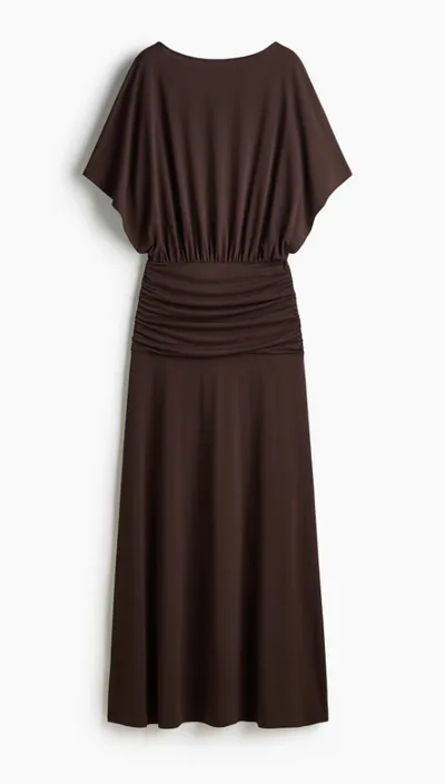 Wat deze creatie echter pas echt tot een onmisbaar stuk maakt, is het uiterst slimme ontwerp. De ontwerpers van de Zweedse modegigant hebben duidelijk goed nagedacht over het vrouwelijk silhouet. Kijk maar eens goed naar de taille. Door het gerimpelde effect rondom het middel wordt je taille prachtig geaccentueerd zonder dat het ergens knelt of oncomfortabel strak zit. Het creëert dat begeerlijke zandloperfiguur waar we allemaal zo van houden. Daarbij zorgen de wijde vleermuismouwen voor een nonchalante elegantie en bieden ze net dat beetje bedekking aan de bovenarmen wat veel vrouwen prettig vinden. De stof valt soepel omlaag waarfoor de jurk bij elke stap die je zet prachtig om je benen danst en je een heel vrouwelijk gevoel geeft.
