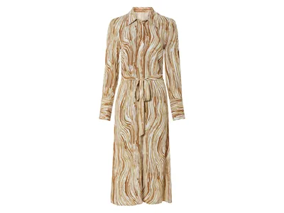 Het eerste wat opvalt, is de print. Geen harde contrasten of druk over elkaar vallende patronen, maar een spel van organische lijnen dat creativiteit uitstraalt. De combinatie van honingbruine, crèmekleurige en licht zandkleurige tonen maakt hem verrassend veelzijdig. Je trekt hem aan en zonder enige moeite ziet het geheel eruit alsof je er uitgebreid over hebt nagedacht. Dat is de kracht van dit ontwerp: het werkt altijd!