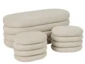 De set bestaat uit een royaal opbergbankje en twee bijpassende poefen, uitgevoerd in een zachte, crèmekleurige stof. Wat deze specifieke set zo bijzonder maakt, is het organische ontwerp. De golvende vormen en de gestapelde ronde lagen doen denken aan de iconische ontwerpen uit de jaren zeventig, die momenteel een enorme herwaardering beleven in de wereld van de binnenhuisarchitectuur. In een tijd waarin we steeds meer rust zoeken in onze eigen omgeving, bieden deze ronde vormen een zacht tegenwicht aan de vaak strakke en kille lijnen van moderne architectuur. Het is een meubelstuk dat uitnodigt om naar te kijken en dat direct een gevoel van harmonie in de ruimte brengt.