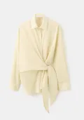Wat deze blouse zo ontzettend bijzonder maakt is de constructie bij de taille. In plaats van een rechte sluiting heeft dit model een ingenieuze overslag met een grote knoop aan de zijkant. Dit is een trucje waar stylisten al jaren bij zweren. Door de stof op dit punt samen te nemen ontstaan er prachtige plooien die diagonaal over je buik vallen. Dit camoufleert eventuele zones waar je misschien wat onzeker over bent en legt de nadruk op het smalste punt van je lichaam. Het creëert optisch direct die gewilde zandlopervorm zonder dat je daarvoor een korset of corrigerend ondergoed hoeft te dragen. De grote strik die nonchalant naar beneden hangt geeft het geheel bovendien een speelse en vrouwelijke twist die je bij standaard overhemden vaak mist.