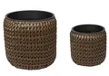 Deze potten zien eruit alsof ze rechtstreeks uit de collectie van een duur designmerk komen. Het geheim zit hem in de prachtige, geweven structuur die doet denken aan natuurlijk rotan. Dit geeft de potten een warme en ambachtelijke uitstraling. De donkerbruine tint is tijdloos, chic en vormt de perfecte achtergrond voor zowel felgekleurde bloeiers als serene groene planten. De set bestaat uit twee verschillende formaten, een pot van 33 bij 30 centimeter en een grotere van 45 bij 42 centimeter. Juist dit verschil in grootte zorgt voor een speels en dynamisch effect wanneer je ze bij elkaar plaatst.