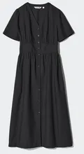 Wat deze jurk écht onweerstaanbaar maakt, is het slimme ontwerp. De ontwerpers hebben overduidelijk nagedacht over het vrouwelijke silhouet en hoe dit het best tot zijn recht komt. De V-hals is subtiel en elegant, en de doorlopende knoopsluiting geeft de jurk een klassieke, tijdloze uitstraling. De taille is voorzien van een gesmokt detail, een briljante vondst die zorgt voor een prachtig zandlopereffect zonder ook maar ergens te knellen. Het accentueert je middel op de meest flatteuze manier. De korte pofmouwtjes voegen een vleugje romantiek en speelsheid toe, precies volgens de laatste trends maar subtiel genoeg om jarenlang mee te gaan. De midi-lengte zorgt er bovendien voor dat de jurk geschikt is voor vrijwel elke gelegenheid.