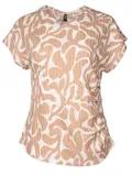 Maar wat dit shirt écht naar een hoger niveau tilt, is het abstracte patroon. De golvende, organische vormen geven het geheel een speelse uitstraling. Hierdoor is het geen saai basisstuk, maar een kledingstuk dat direct de aandacht trekt op een ingetogen manier. De subtiele structuur in de stof voegt daar nog een extra laagje aan toe.