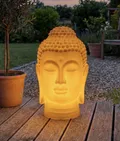 Stel je voor dat de schemering valt. De dag maakt plaats voor de zachte avondlucht en in jouw tuin verschijnt een warme, gouden gloed. Geen felle bouwlamp, maar het serene licht van een prachtig vormgegeven Buddha hoofd. Met een indrukwekkende hoogte van vijftig centimeter is dit geen klein beeldje, maar een echt statement piece. De zachte gelaatstrekken en de kalme uitstraling van het beeld zorgen onmiddellijk voor een gevoel van ontspanning. Plaats hem tussen je planten, op je vlonder of op het balkon en je creëert moeiteloos een hoekje waar rust en stijl samenkomen. Het warmwitte licht is perfect voor die lange, zwoele zomeravonden waarop je alleen of met goed gezelschap wilt genieten van de stilte.