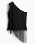Neem nu deze zwarte, asymmetrische top. Het is het perfecte voorbeeld van hoe je de trend anno nu draagt: sleek, sexy en geraffineerd. De basis is simpel, maar de lange franjes die tot over de heup vallen, zorgen voor dat instant wow-effect. Het geeft je outfit letterlijk en figuurlijk schwung.