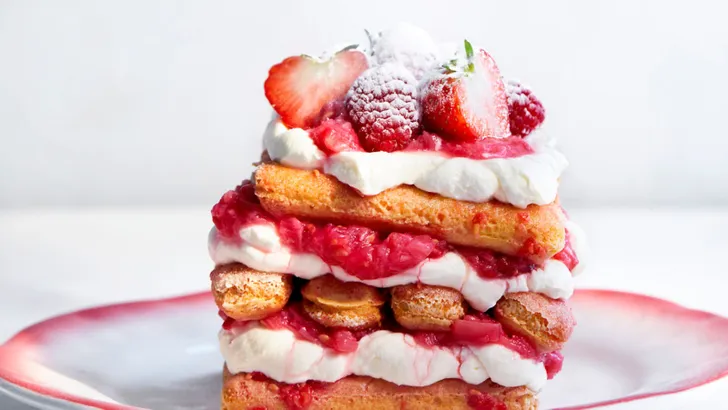 Leg 4 lange vingers op een bord en spuit hier een derde van de crème op en verdeel er ook 2 eetlepels van de rabarbercompote over. Herhaal deze lagen nog twee keer. Garneer met gehalveerde aardbeien, de overige frambozen en een beetje poedersuiker voor een feestelijke finishing touch!