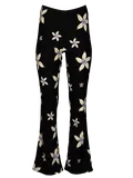 Wat deze specifieke broek zo leuk maakt, is het contrast. Waar bloemenprints al snel wat zoetsappig kunnen worden, heeft dit exemplaar een stoere, zwarte basis. Daarop prijken grote, crèmekleurige bloemen met een verrassend zacht lila hart. Deze donkere ondergrond geeft de vrolijke lente-trend meteen een volwassen en stijlvolle touch.