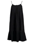 Sommige items vinken simpelweg alle vakjes aan, en dit zwarte exemplaar is daar één van. Wat dit jurkje tot zo’n onmisbare, heerlijke basic maakt, is de eenvoud. De dunne bandjes, de subtiel gerimpelde halslijn en de zwierige, gelaagde strook aan de onderkant geven het ontwerp een effortless chic uitstraling.