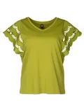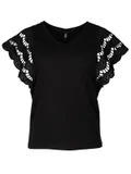 Dit T-shirt met V-hals is veel meer dan zomaar een simpel shirt. De eyecatcher? De prachtig bewerkte mouwen met opengewerkt borduurwerk. Deze embroidery details geven het item een verfijnde, bohemian vibe die je outfit direct een speelse en vrouwelijke uitstraling geeft. Of je nu kiest voor de tijdloze zwarte variant of gaat voor de frisse, diepe groene kleur: dit shirt is een stijlvolle toevoeging aan iedere garderobe.