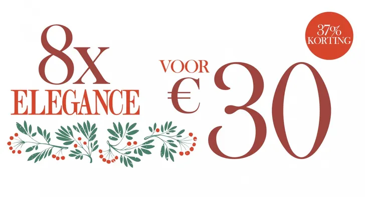 Het maakt niet uit of je aan lootjes doet, of voor het hele kerstgezelschap een geschenk koopt, in beide gevallen is een Elegance-abonnement het perfecte cadeau. Met Elegance ben je namelijk altijd op de hoogte van de laatste ontwikkelingen op het gebied van mode, reizen, culinaire zaken, interieur, literatuur en kunst & cultuur. En het leuke is: als je via deze link een abonnement afsluit, ontvangt de gelukkige krijger een jaar lang Elegance (dus 8 edities) in de brievenbus. Wat jij daarvoor betaalt? Slechts €30! O, en Elegance is niet alleen leuk om te geven, maar ook om te krijgen... Onthouden dus!