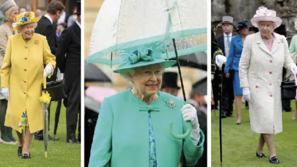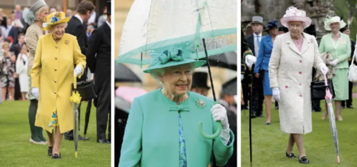 Ja, dat lees je goed, de koningin heeft voor ieder lookje een bijpassende paraplu. Wat wij ons dan afvragen is of ze ook een aparte plu-emmer voor al deze koninklijke versies heeft.
