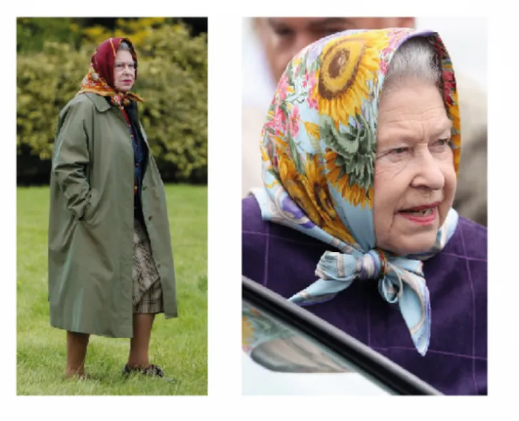 Om heur halsje te beschermen tegen het Britse weer siert er altijd een sjaaltje om Hare Koninklijke nek. We kijken er dan niet van op dat ze alleen maar de zijden varianten van Hermés draagt.