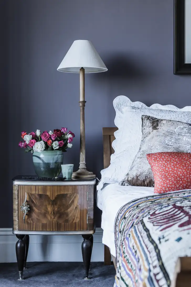 Voor de verzameling van haar kunst en interieur schatten is Jan regelmatig de grens overgestoken. Zo kocht ze het geborduurde dekbed voor de master bedroom op een markt in India. ‘Het herinnert mij elke dag aan een dierbare reis en de periode waarin ik de lm Holy smoke! maakte.’ Een ander gekoesterd item in de slaapkamer is het groene bijzettafeltje naast haar leesstoel. Verder staat er, op haar fauteuil, nachtkastjes en bed na, weinig. Less is more is het decoratiemantra wat hier overheerst. Geen expressieve kunstwerken en pastelkleurige muren dus, maar alle grote oppervlakken in één kleur: dieppaars. Sfeervol, sereen en tevens Jans lievelingskleur. Uniek is het slaapkamerbrede balkon, dat niet alleen een weids uitzicht op zee biedt, maar ook een essentiële sfeermaker in de ruimte is: ‘Het balkon is niet alleen een van mijn favoriete plekken om walvissen te spotten, maar fungeert ook als levend schilderij.’ En omdat de slaap kamer rustig is in kleur en accessoires, wordt het balkon optimaal bij de ruimte betrokken en krijgt het alle aandacht die het verdient.